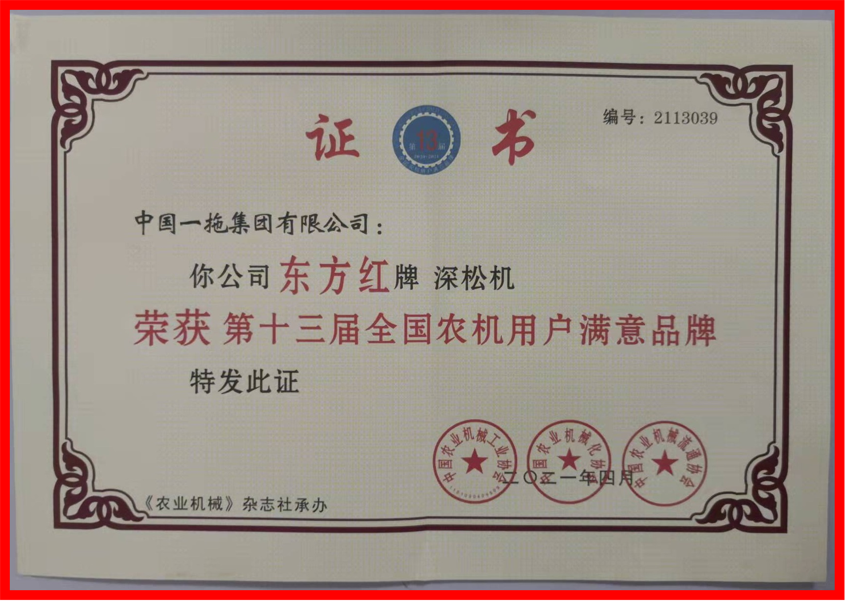 第十三屆全國農機用戶滿意品牌東方紅深松機